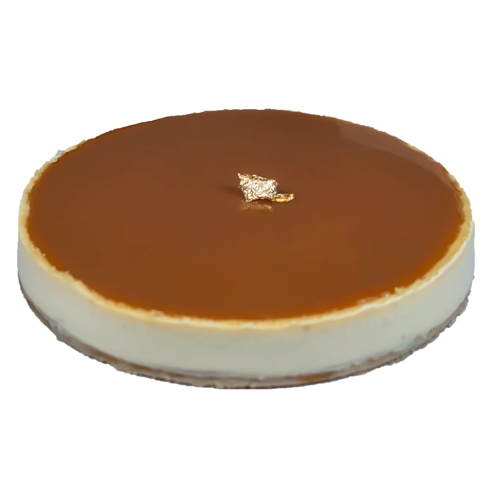 Pure indulgence with a modern flair. A rich, silken cheesecake finished with a shimmering caramel top and a touch of luxury gold for a stunning presentation.